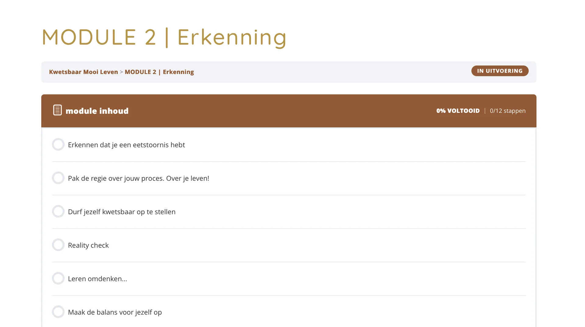 Het programma bestaat uit twaalf modules, verdeeld over vier fases. Je werkt in je eigen tempo. Elke module bevat video's, oefeningen en een werkboek.